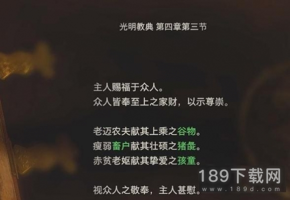 1. 村长宅邸走楼梯上二楼,桌上看到文件【光明教典 第四章第三节】。