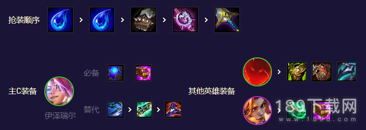 EZ的核心装是蓝buff配法爆,第三件做巨杀或破防者拉满爆发。主T石头人做纯肉装,最好有反甲,其次做狂徒、板甲或龙爪即可。副C看情况安排,卢锡安能3星的话就给多余的AP装,否则就在后期给女枪做青龙刀配其他AP装,如果大EZ出的早也可以给攻击装养成C位。