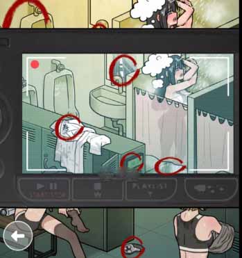 4、最后再使用放大镜去寻找剩下几个线索,在右侧那个没人的帘子里,还有洗手池边上,那个符咒的位置。
