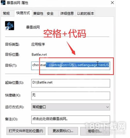 2、在快捷方式的目标栏中,先属于空格,再加入神秘代码“ --setregion=US --setlanguage=enUS”