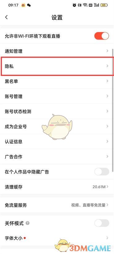 3、进入到设置的页面中点击隐私的功能选项;