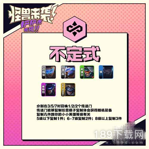 不定式羁绊:3/5/7:召唤1/2/2个传送门传送门是能够复制到任意的棋子的还可以获取到随机的装备。复制几件跟小小英雄等级有关5级以下复制1件、6-7级复制2件、8级以上复制3件