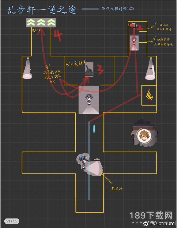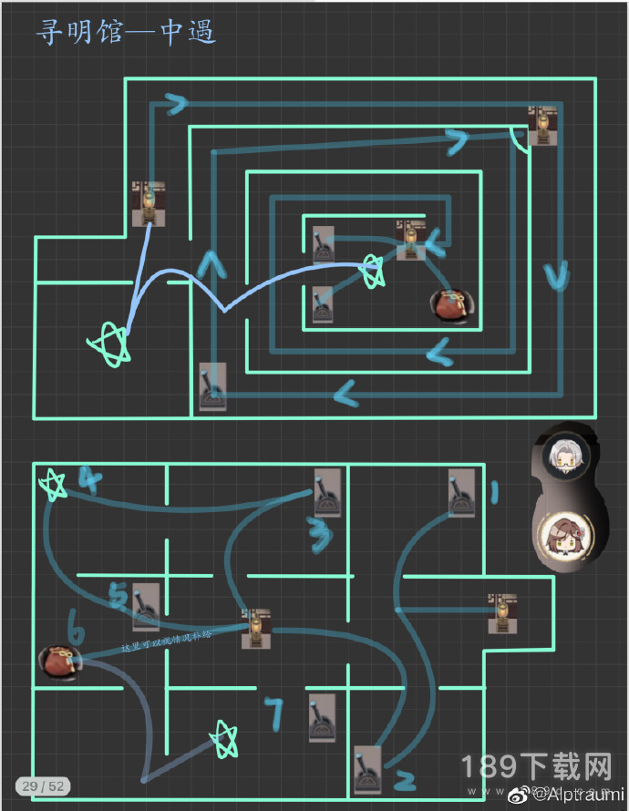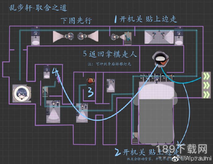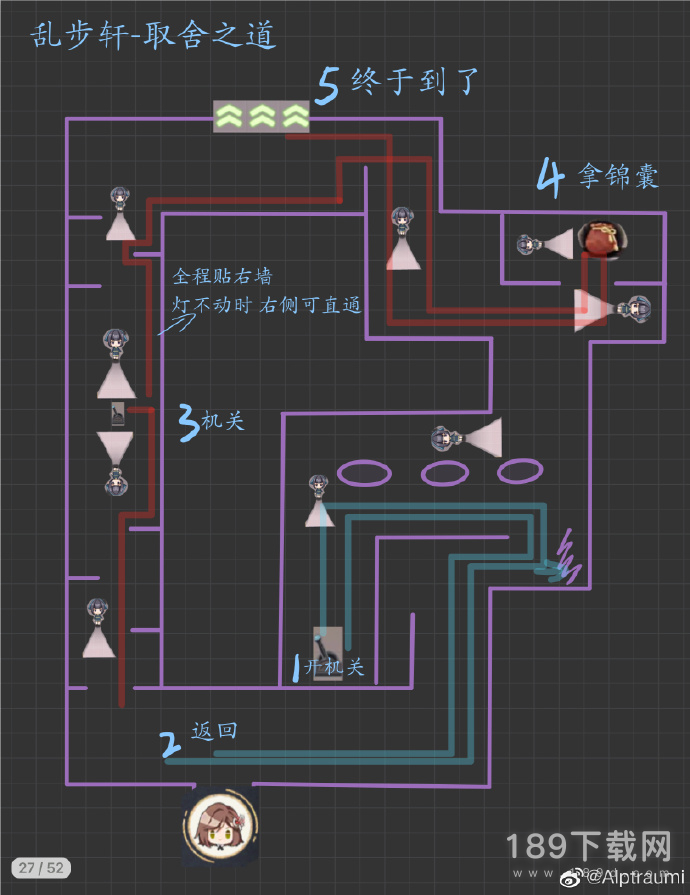 图中路线为个人推荐路线,尽量做到躲避灯光的位置,但毕竟会动还是要各位夫人还是要注意下灯啦over