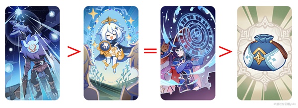 这四张牌开局无脑留就行了。开局最胡的一种打法就是:剑鬼首发冰+风分身,然后打出深渊召唤一个丘丘人,只要不是冰丘丘人,下一轮扩散一个元素对于对面后台两个被挂了冰的角色来说就是毁灭性打击。所以小派蒙得留一下,因为3冰骰+3风骰+2个相同骰真不是靠普通的运气能丢的出来的,绝大多数时候我们得靠小派蒙或者一掷乾坤来改骰子(欧皇除外)。星天之兆是为了第二回合能够直接给剑鬼充能开大,所以也很关键。食物袋是因为我们这套卡带了大量的食物,基本过滤牌库就依靠它了,看见就留